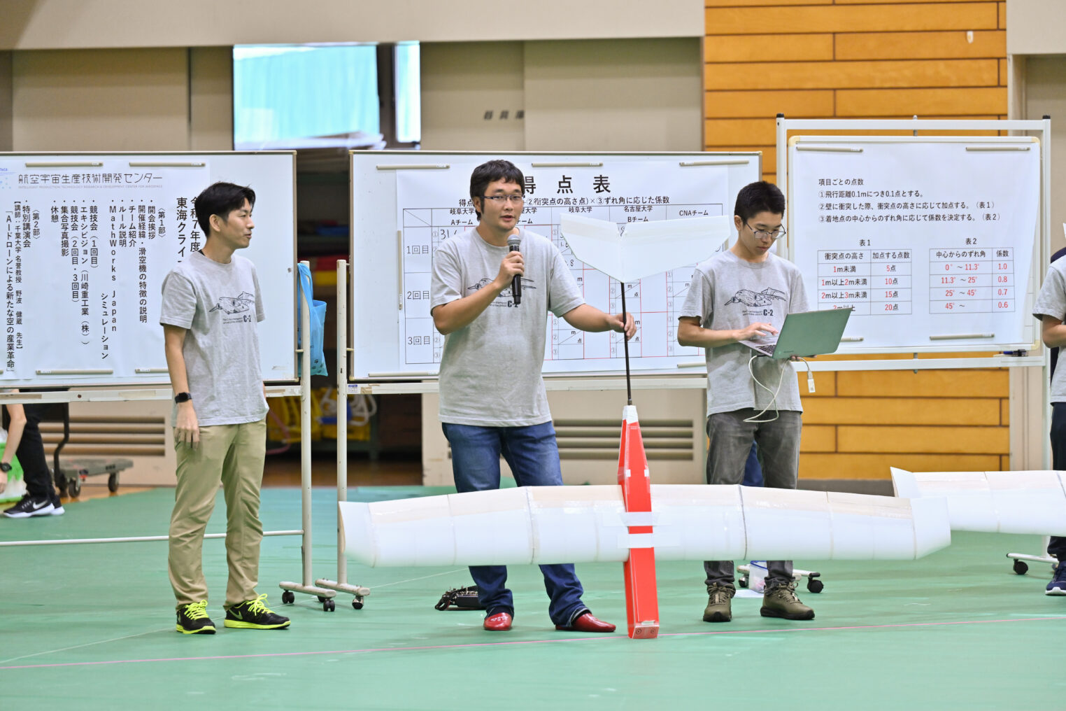 競技会は岐阜大学Bチームが総合得点50.0点で優勝し、57メートルを超える素晴らしい飛行を見せました。また、川崎重工業株式会社の有志チームによるエキシビションマッチも行われたほか、各学生チーム機体のデザイン投票を来場者全員にご参加いただき、最も投票の多かった中日本航空専門学校チームがデザイン賞を授与する等、過去最多の観客数もあり、盛り上がりを見せました。