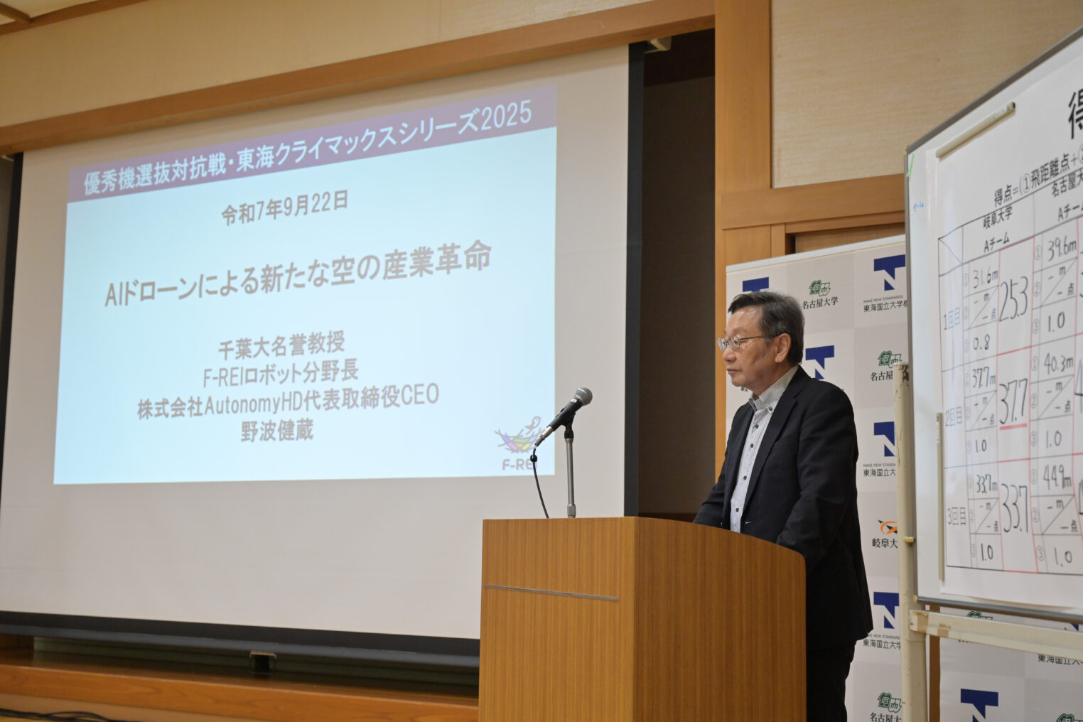 また、千葉大学 名誉教授/福島国際研究教育機構(F-REI)ロボット分野長/日本ドローンコンソーシアム(JDC)会長/先端ロボティクス財団理事長/株式会社AutonomyHD代表取締役CEO、野波健蔵先生から、「AIドローンによる新たな空の産業革命」と題して特別講演をいただき、学生にとってはまたとない貴重なお話を伺う機会となりました。