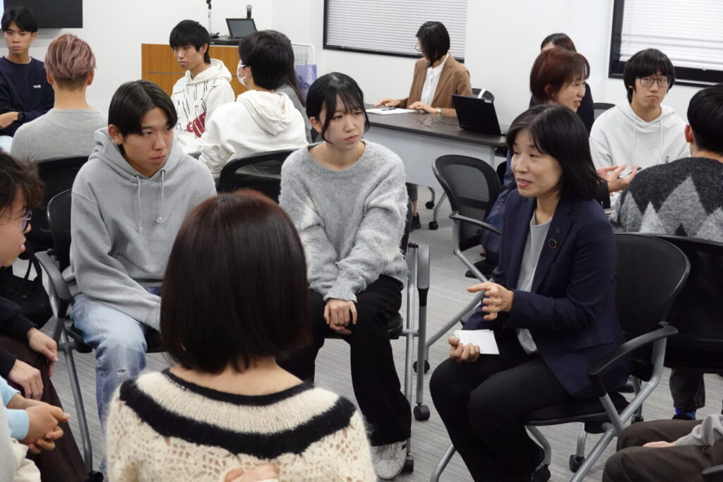 座談会で学生と対話する 落合氏